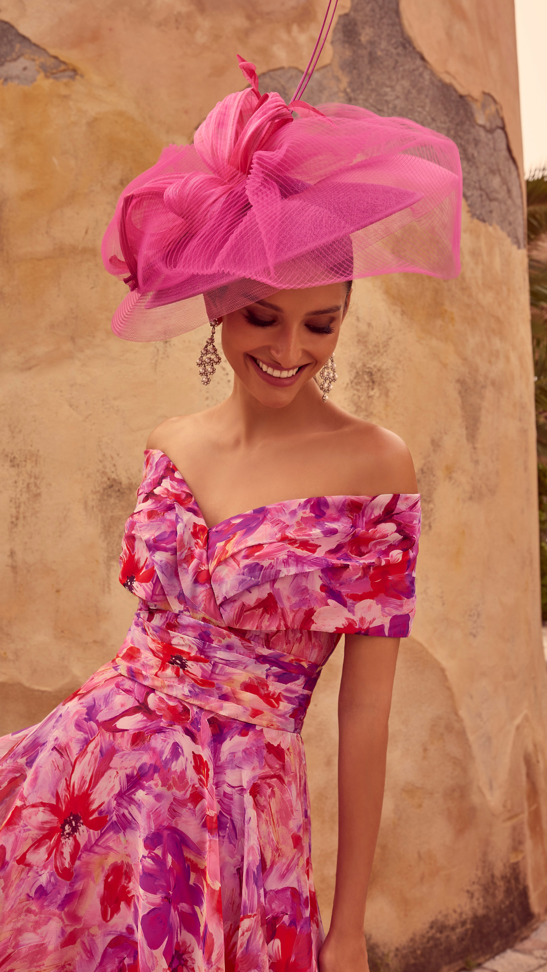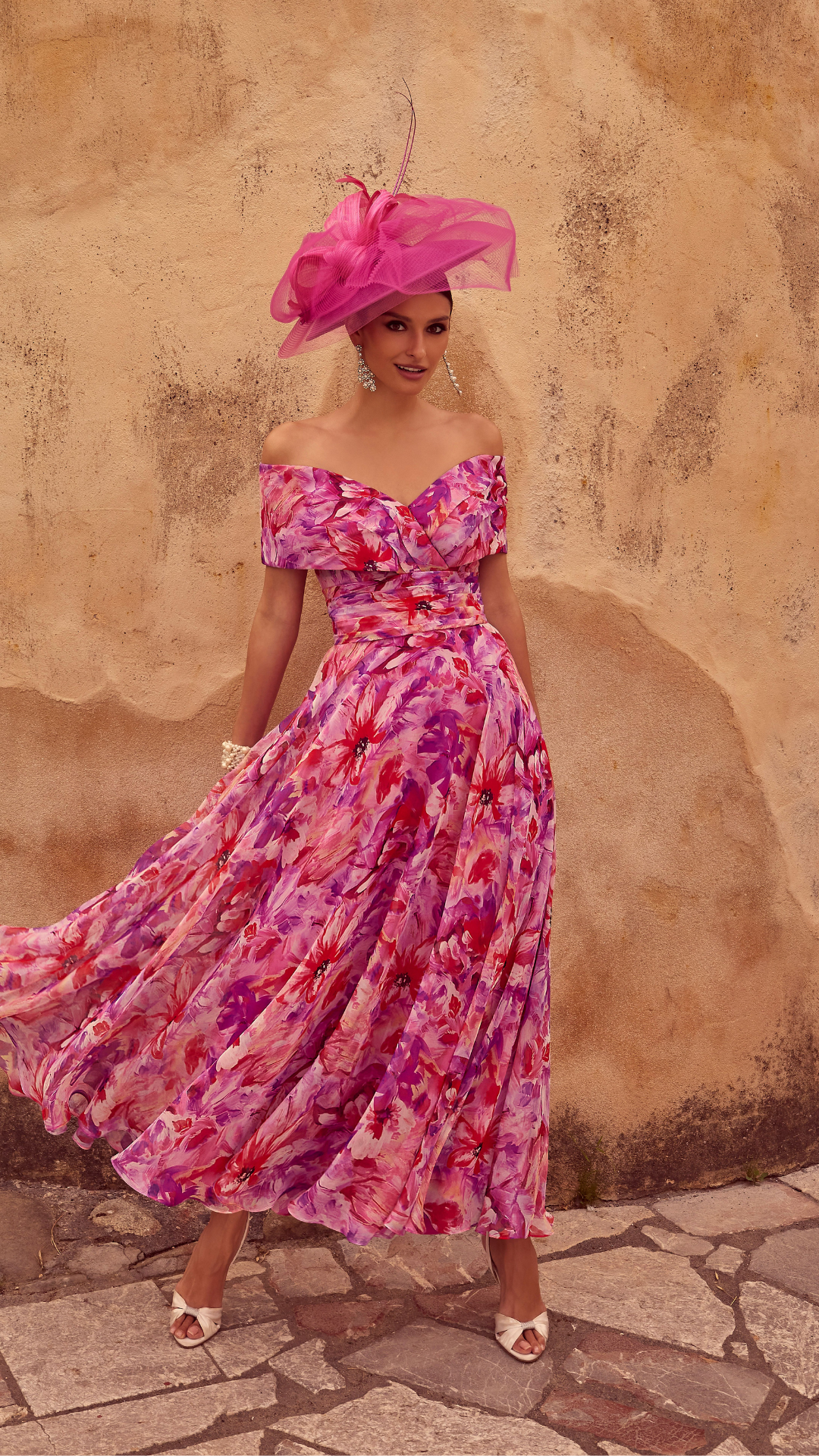 A unique A-line chiffon wedding guest dress, featuring pleated off the shoulder neckline and pleated cinched waist.