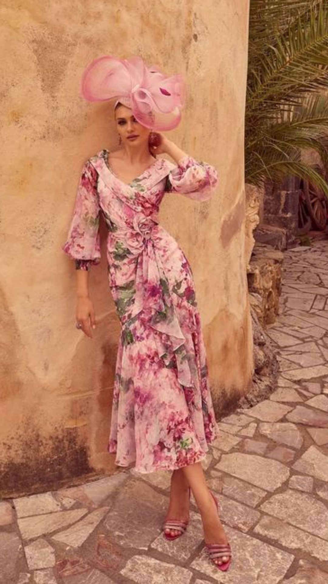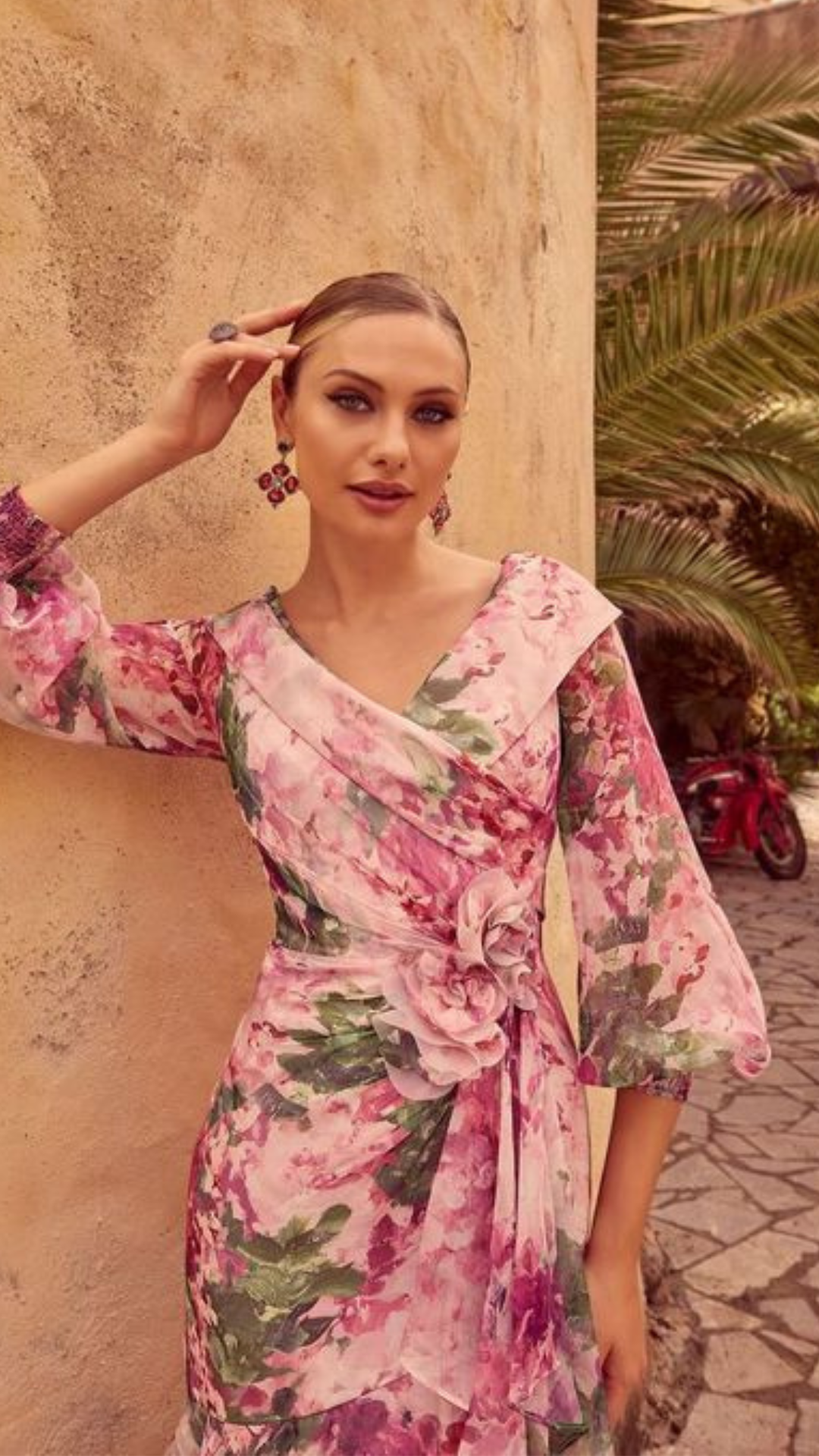 A fit and flare floral printed chiffon dress, featuring a wide V-neckline and 3D floral motifs.