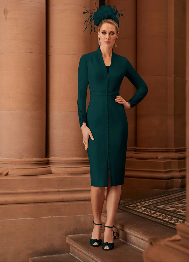 A simple and elegant dress with a button front bodice and lace and button back bodice. The cuff on the sleeves have the same lace.