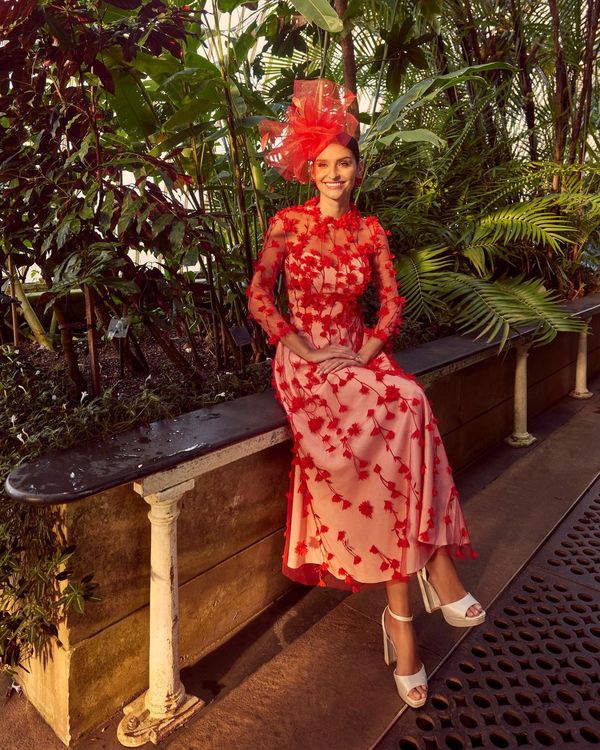 A relaxed A-line dress, with a high neckline and 3/4 sleeves. Featuring striking bold 3D flowers and vine.
