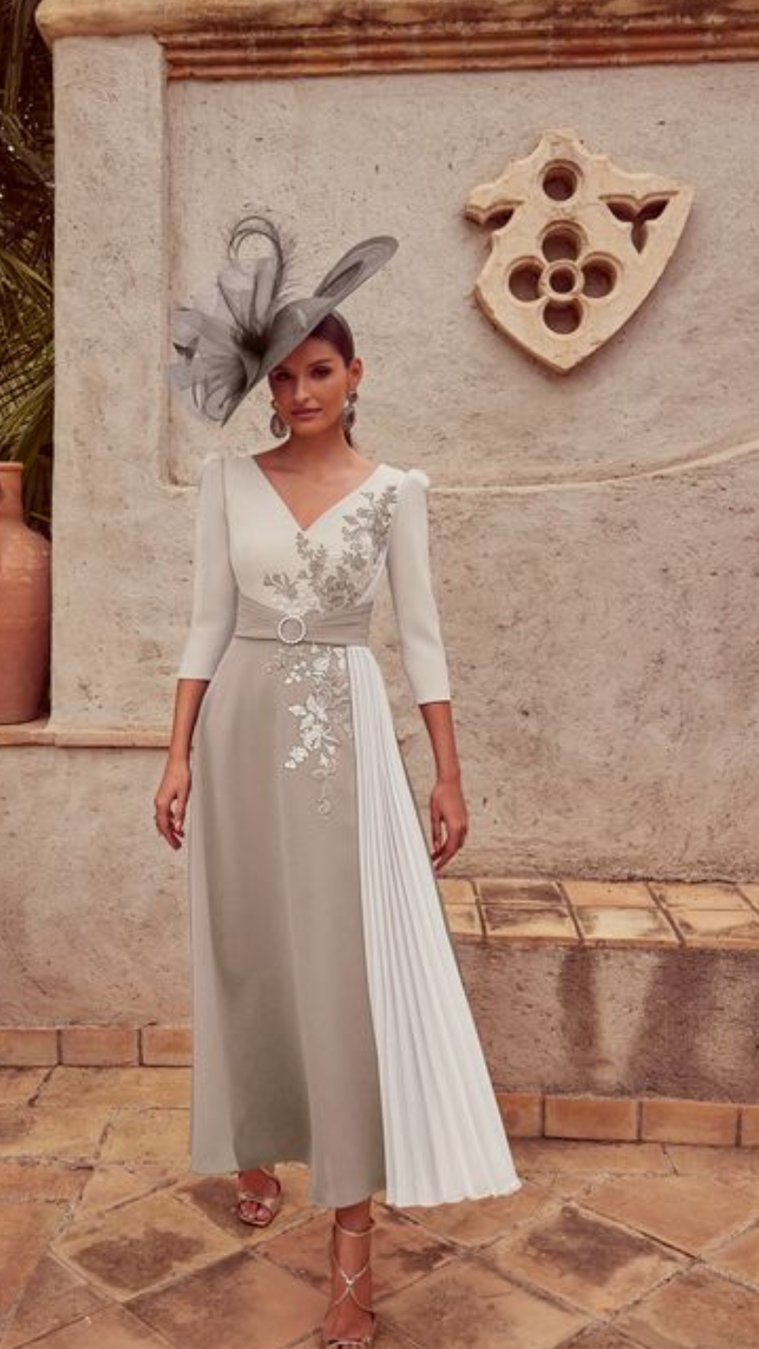 A relaxed crepe and chiffon A-line dress with an v-neckline and 3/4 sleeve detail. This wedding guest dress features beaded lace appliques on the bodice and a two tone bodice to skirt.