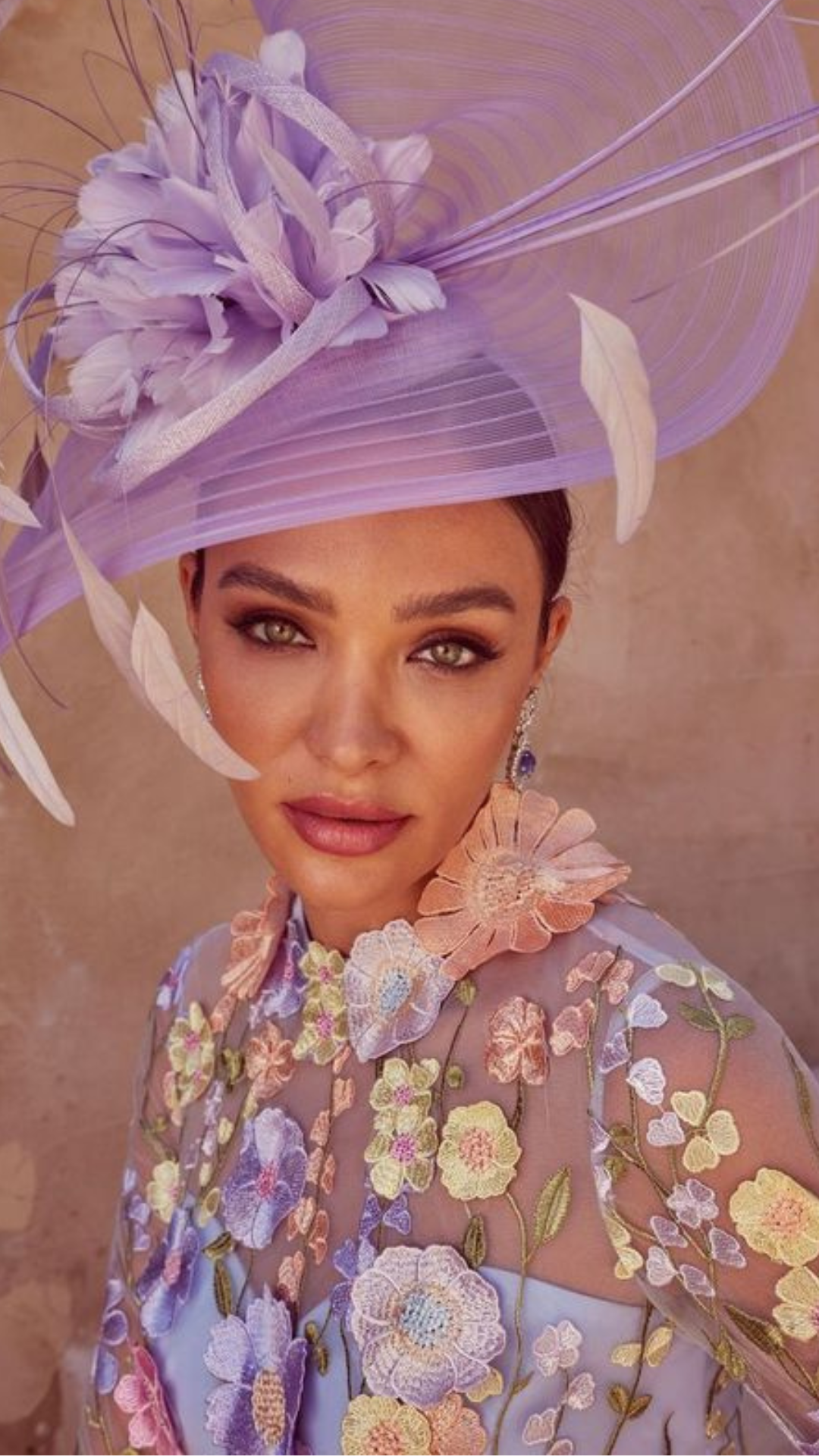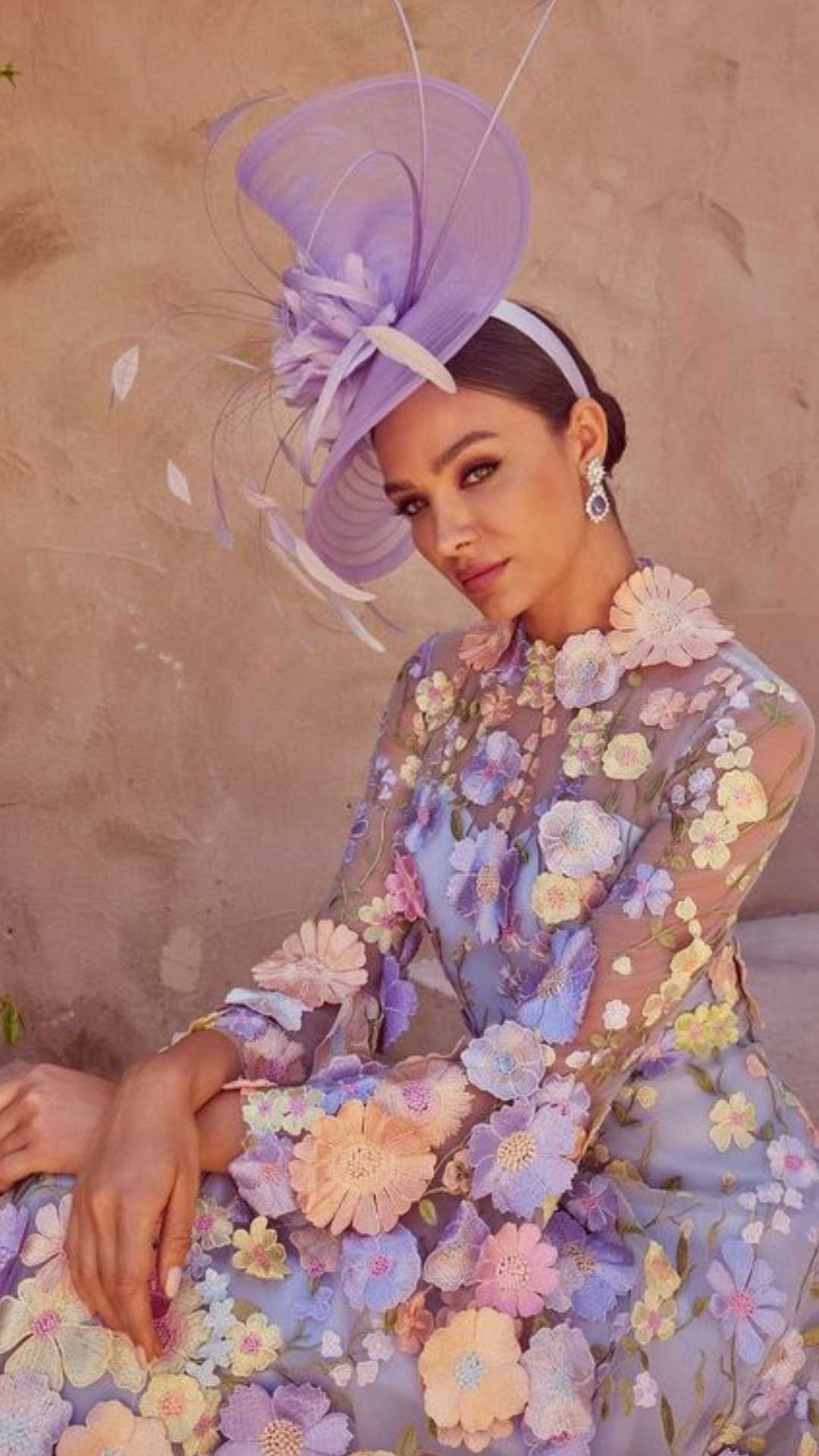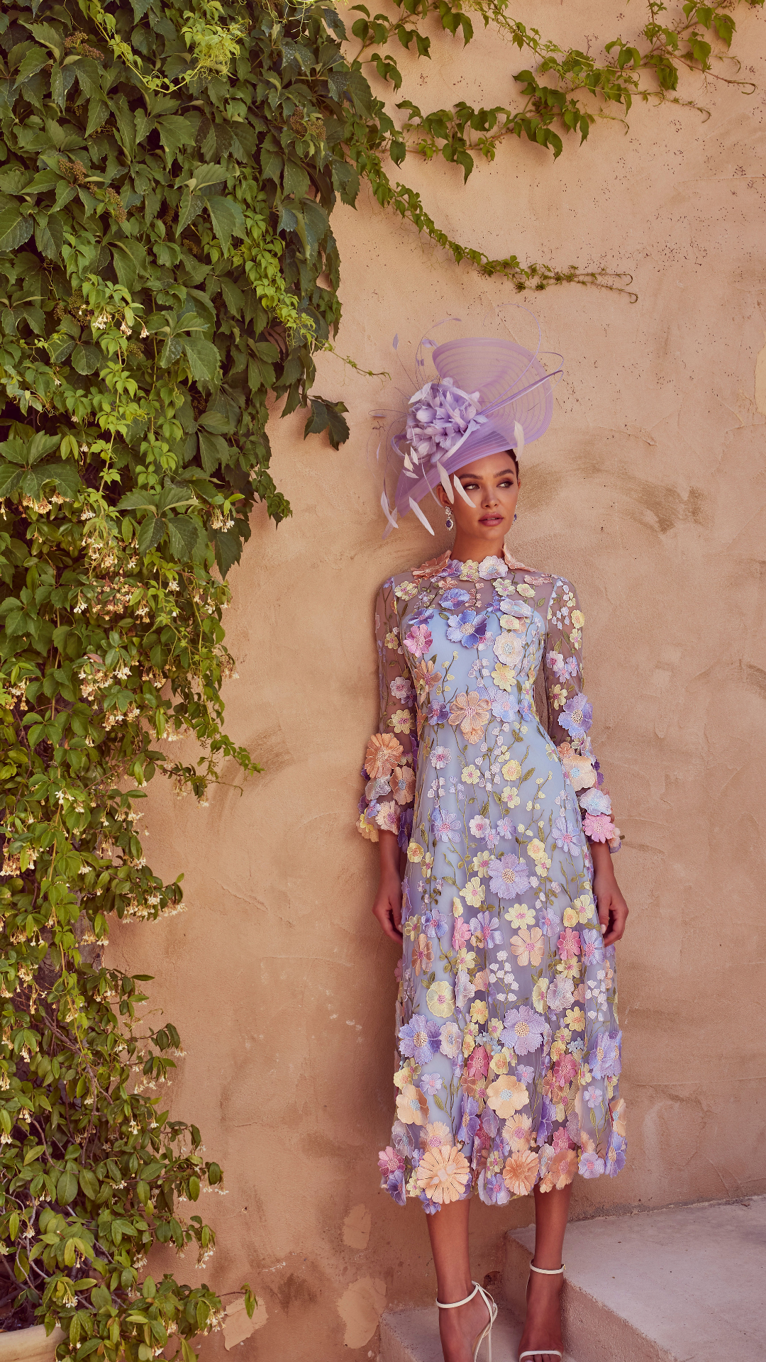 A modern, A-line botanical dress, featuring 3D flowers, and 3/4 bell sleeves, with a high illusion neckline.