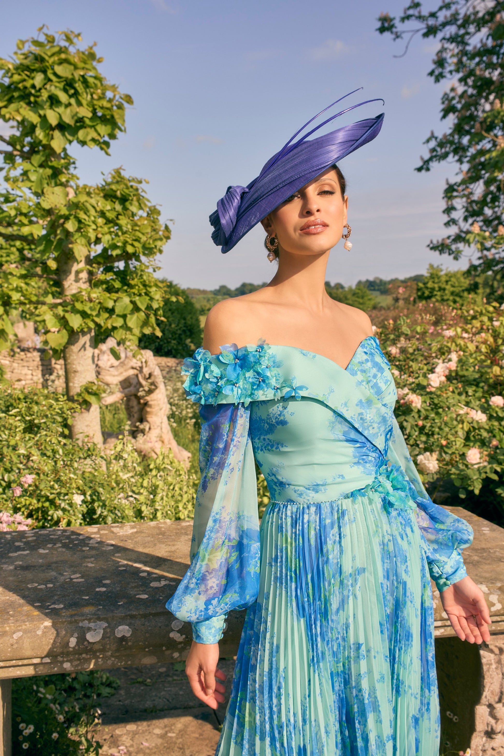 Chic and contemporary, this off-the-shoulder A-line chiffon dress features a wide V-neckline, sheer bishop sleeves, and a flowing pleated skirt. 3D floral appliqués on the waistband offer subtle drama, perfect for making a statement at a wedding or day at the races.